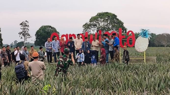Di Desa Penghasilan nanas terbesar di Jambi ini, Menteri Desa Yandri Susanto memberikan bantuan ke BUMDes dan panen nanas bersama Gubernur Al Haris dan A Bakrie.