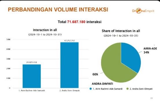 Dari data analisis Drone Emprit Popularitas pasangan Andra soni-Dimyati di media sosial mendapatkan perhatian publik dengan 67% porsi pembicaraan.
