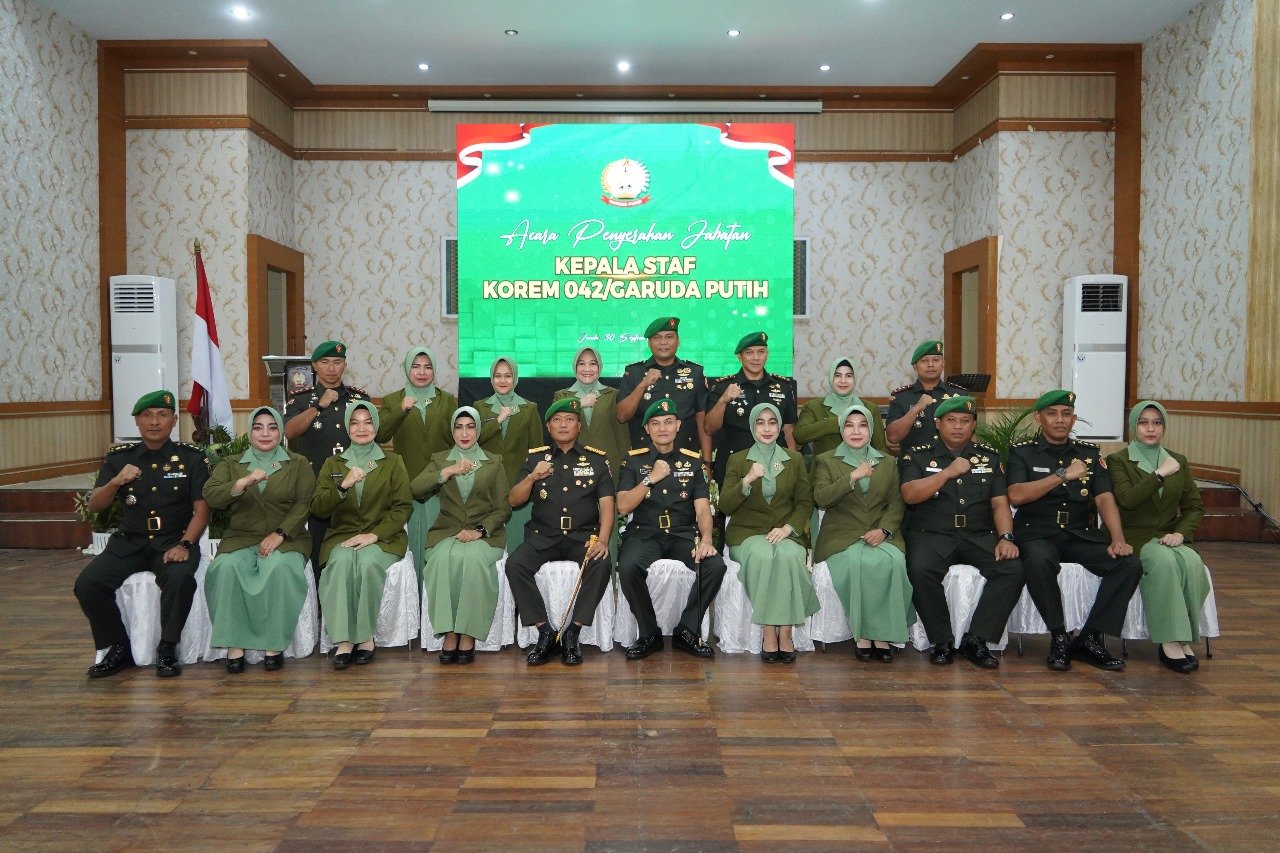 JAMBI,BITNews.id – Komando Resor Militer (Korem) 042/Gapu menggelar acara penyerahan jabatan Kepala Staf Korem (Kasrem) 042/Gapu pada Selasa (30/9/2025). Acara berlangsung di Makorem 042/Gapu Jambi dan dipimpin langsung oleh Danrem 042/Gapu Brigjen TNI Heri Purwanto, S.E., M.Sc.