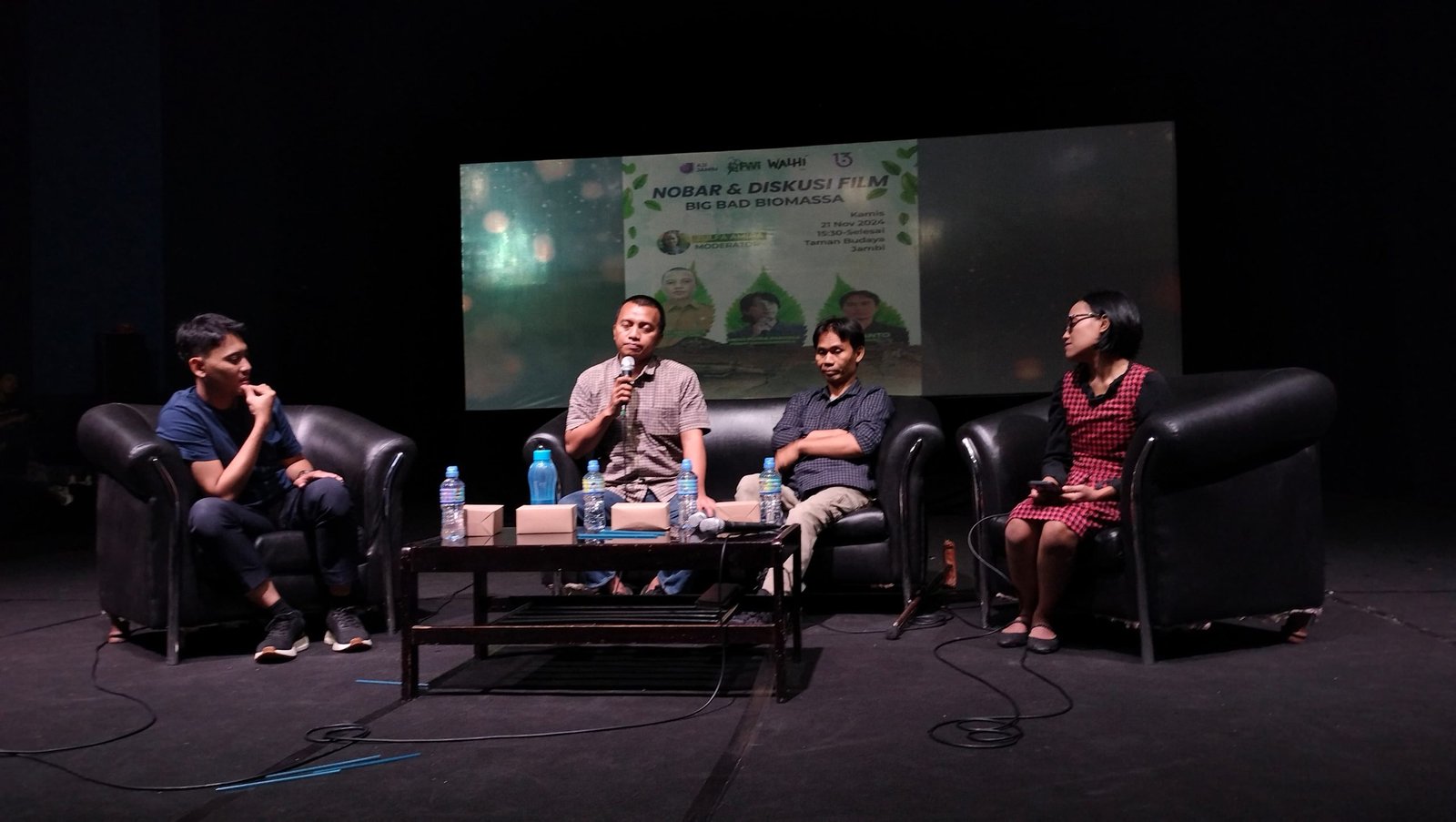 Para narasumber dan pemantik diskusi film itu, yakni Manajer Kampanye dan Intervensi Kebijakan Forest Watch Indonesia (FWI) Anggi Putra Prayoga, Manajer Kajian dan Penguatan Informasi Walhi Jambi Dwi Nanto, dan Kabid Energi Dinas ESDM Provinsi Jambi S Pandu Hartadinata.