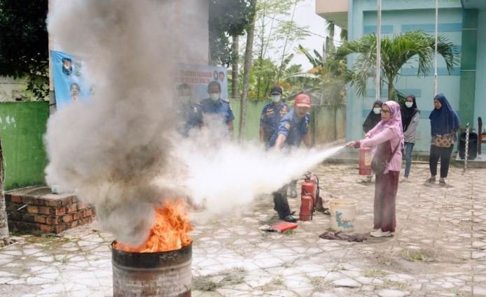 Setelah sesi materi di dalam ruangan, peserta melakukan praktik lapangan dengan bimbingan personel Damkar. Mereka dilatih cara memadamkan api menggunakan kain basah dan APAR, serta teknik mengatasi kebakaran akibat kebocoran gas secara aman.