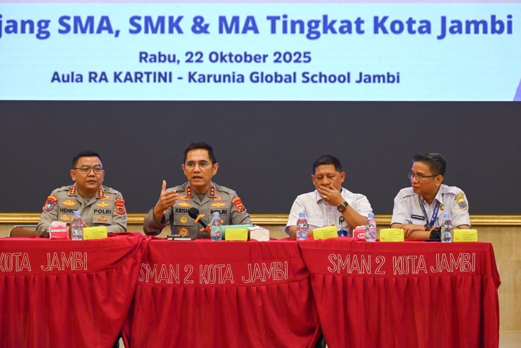 JAMBI, BITNews.id – Kepala Kepolisian Daerah (Kapolda) Jambi Irjen Pol Krisno H. Siregar menghadiri kegiatan Sosialisasi dan Peningkatan Kompetensi Guru Bimbingan Konseling (BK) jenjang SMA, SMK, dan MA se-Kota Jambi yang digelar di Aula R.A. Kartini Karunia Global School, Rabu (22/10/2025).