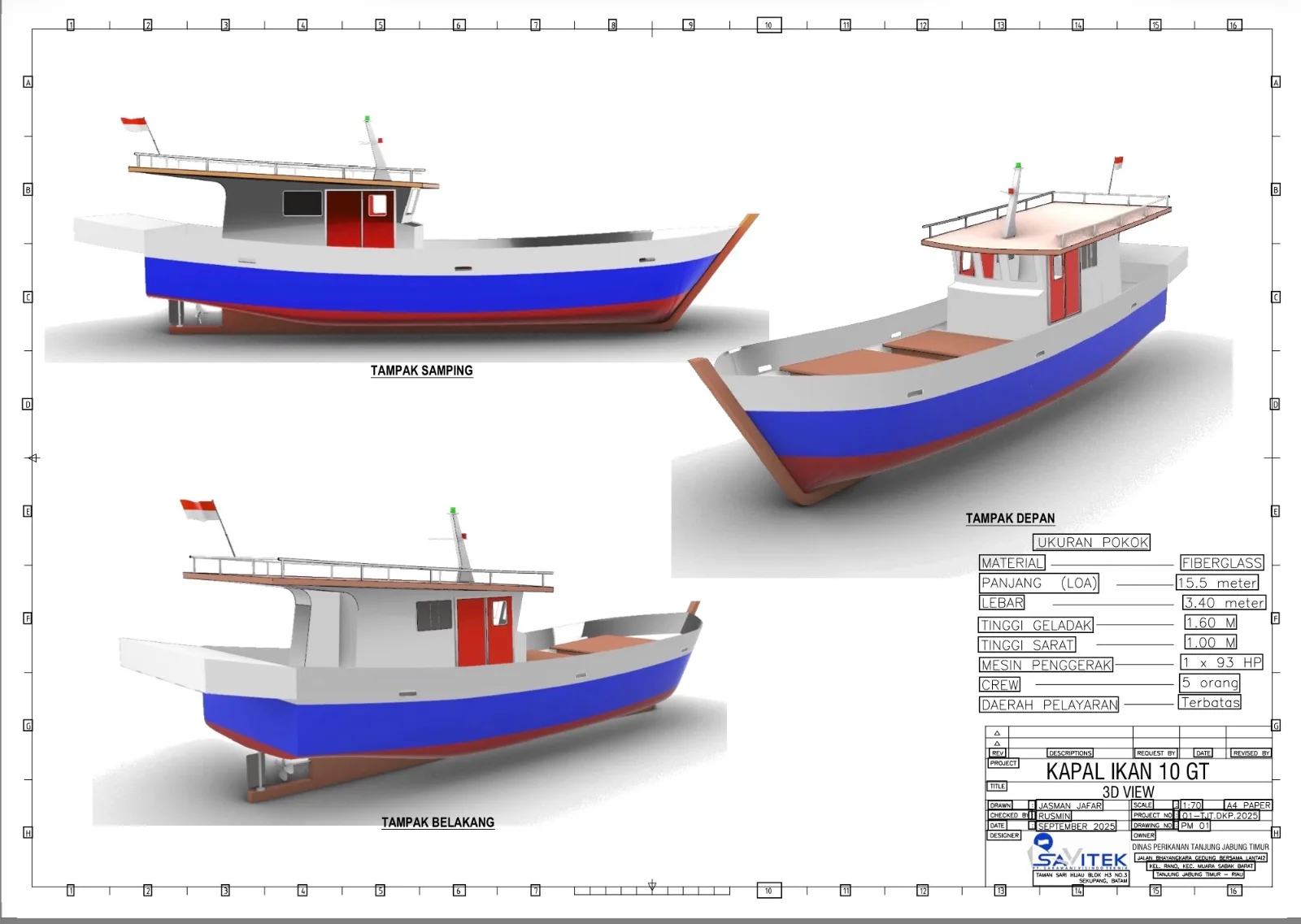 Terkait kapal nelayan Tanjabtim yang dikerjakan perusahaannya, ditegaskan Bambang tidak ada sama sekali perbedaan dengan dokumen perencanaan dan sesuai dengan hasil survei di lapangan tempat calon penerima bantuan kapal sebelum dikerjakan. Hanya saja, tambahnya, ruang tertutup pada kapal kayu nelayan yang dijadikan acuan dalam survei,lebih sedikit.