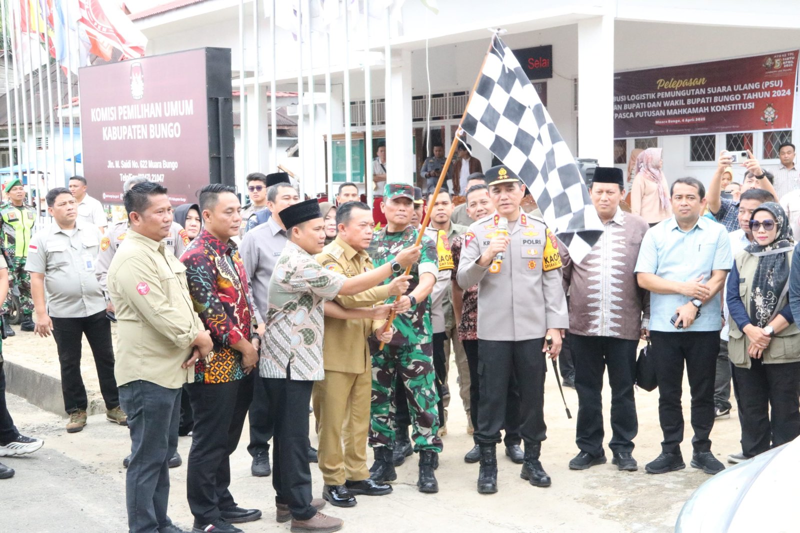 JAMBI,BITNews.id – Kapolda Jambi Irjen Pol. Krisno H. Siregar ikuti pelaksanaan pelepasan distribusi logistik kotak suara di Kantor KPU Kab. Bungo pada Jumat (4/4/2025).
