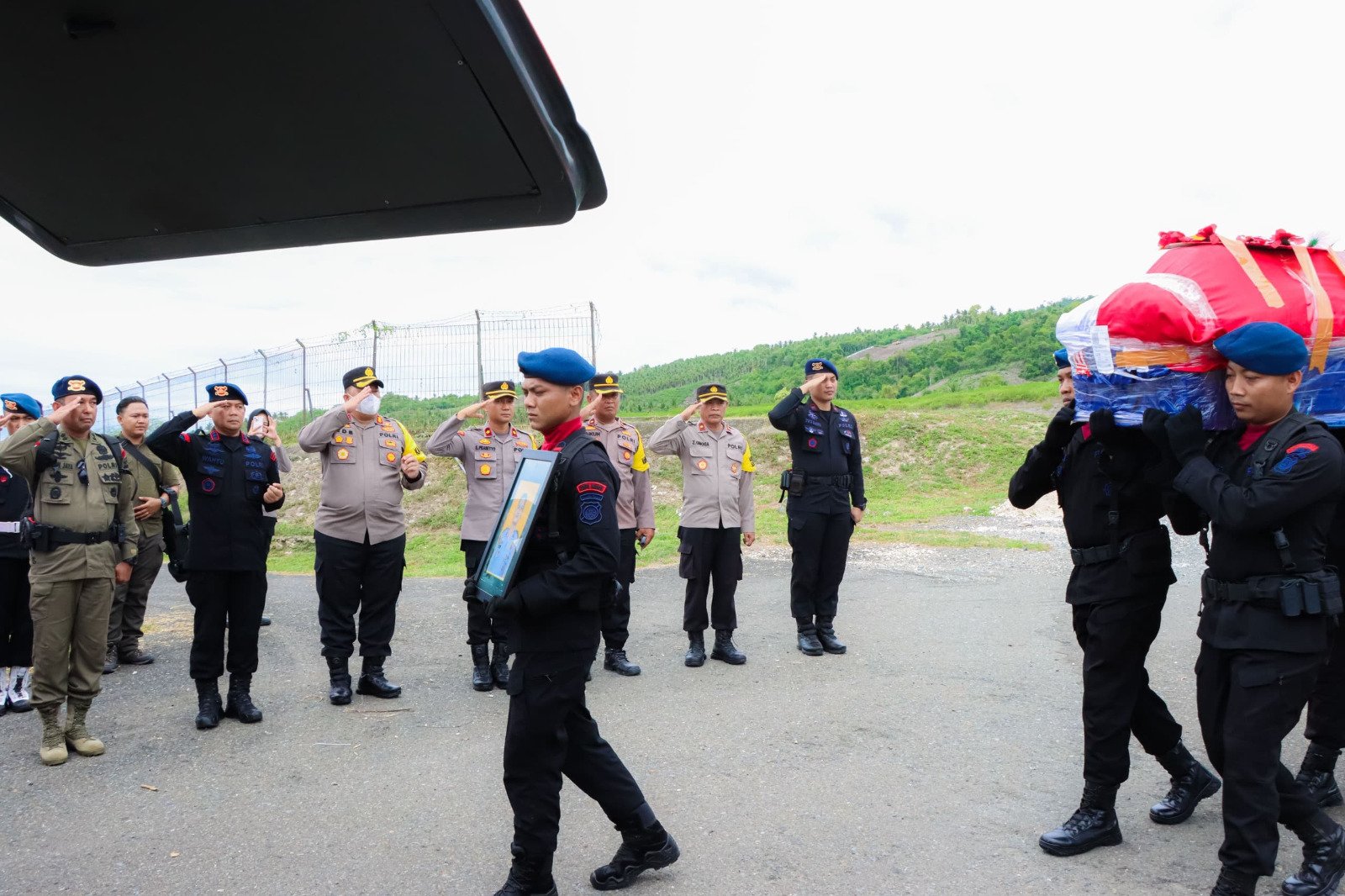 “Kedatangan jenazah di Bandara Syukuran Aminuddin Amir Bubung Luwuk ini didampingi langsung Danmen 3 Paspor Korps Brimob Polri Kombes Pol Wahyu SIK, SH dan Kasatgas Tindak Operasi Damai Cartenz AKBP Irwan Jaya dan satu personel Bripda Khozin,” kata Kasi Humas Polres Banggai Iptu Al Amin S. Muda.