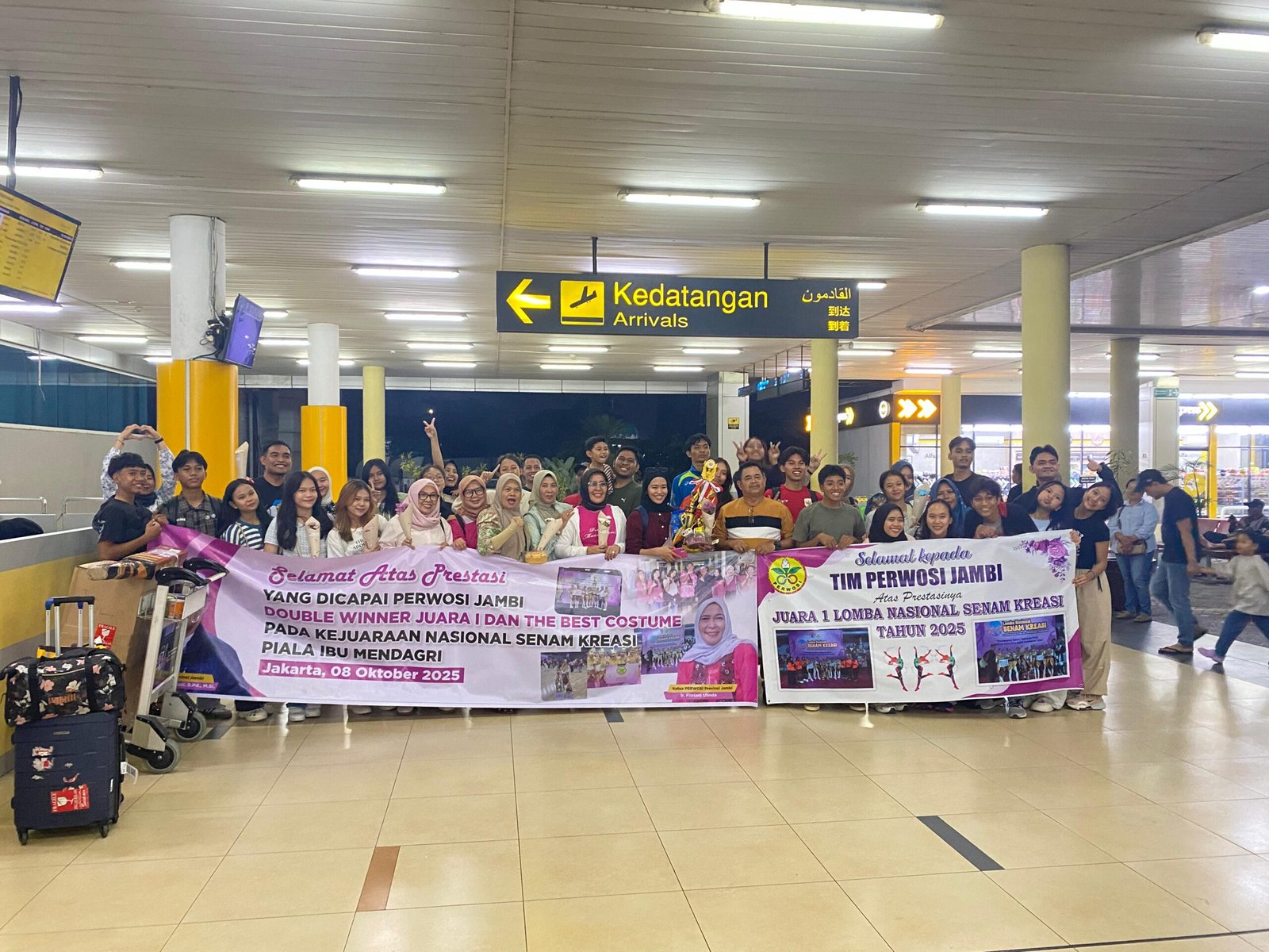 JAMBI,BITNews.id – Wakil Ketua Umum IV KONI Provinsi Jambi DR Sukendro, menyambut kedatangan Tim Senam Perwosi Jambi di Bandara Sultan Thaha Jambi, Sabtu (11/10/2025).