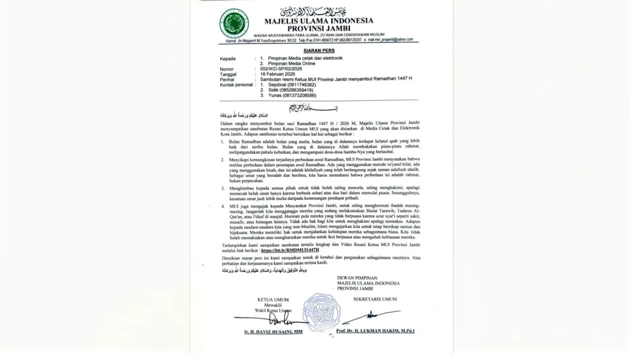 JAMBI, BITNews.id – Majelis Ulama Indonesia (MUI) Provinsi Jambi secara resmi merilis seruan bagi seluruh umat Muslim dan masyarakat di Bumi Sepucuk Jambi Sembilan Lurah dalam rangka menyambut bulan suci Ramadhan 1447 Hijriah/2026 Masehi. Melalui siaran pers resmi yang dikeluarkan pada 16 Februari 2026, MUI menekankan pentingnya menjaga ukhuwah (persaudaraan) dan semangat toleransi di tengah potensi perbedaan awal puasa.