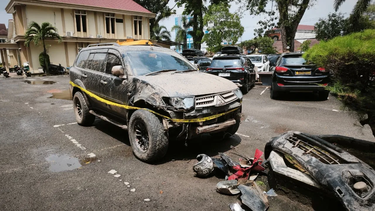 Mobil akhirnya masuk ke kawasan Mapolda Jambi, menabrak Honda PCX yang dikendarai Niko (17) berboncengan dengan Fahri Alviando (16), serta satu unit Honda Beat lain yang pengendaranya masih dalam penyelidikan.