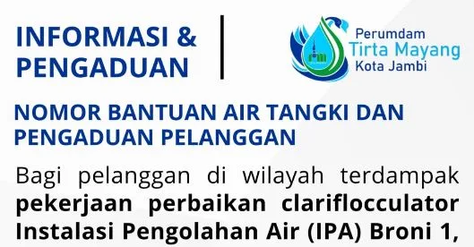 JAMBI, BITNews.id – Perusahaan Umum Daerah Air Minum (Perumdam) Tirta Mayang Kota Jambi mengimbau pelanggan menampung persediaan air menjelang pekerjaan perbaikan unit clariflocculator di Instalasi Pengolahan Air (IPA) Broni 1 yang berlangsung selama delapan hari, mulai 25 April hingga 2 Mei 2026.