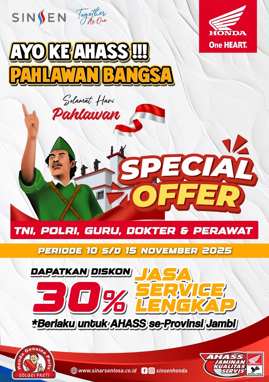 JAMBI, BITNews.id – Dalam rangka memperingati Hari Pahlawan Nasional yang jatuh pada 10 November, PT Sinar Sentosa Primatama (Sinsen) selaku Main Dealer sepeda motor Honda di Provinsi Jambi menghadirkan program “Special Offer Hari Pahlawan”.
