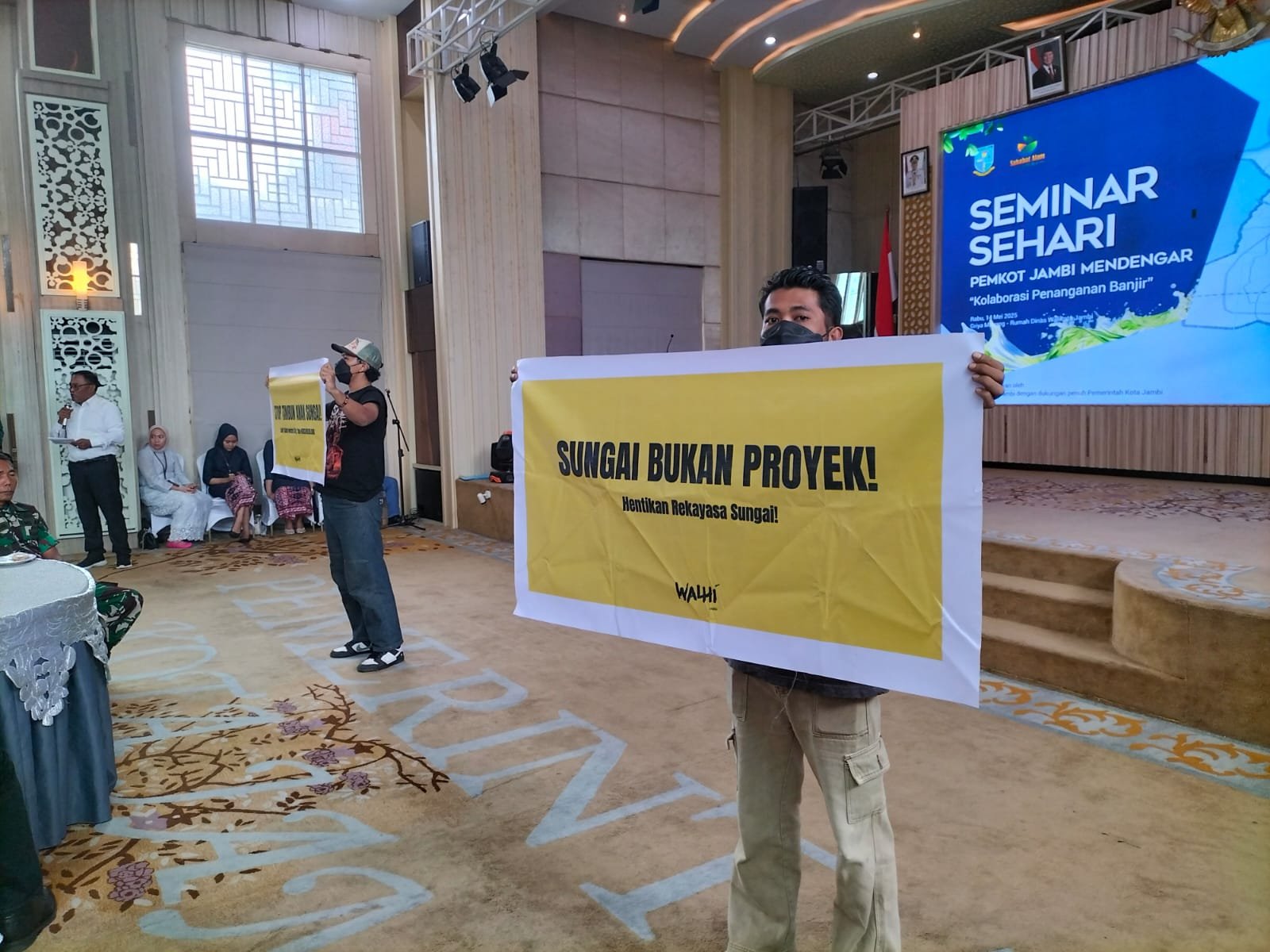 Aksi ini disampaikan dengan membentang poster dalam forum Seminar Sehari “Pemkot Jambi Mendengar” yang berlangsung di aula Rumah Dinas Walikota Jambi pada Rabu (14/05/2025).